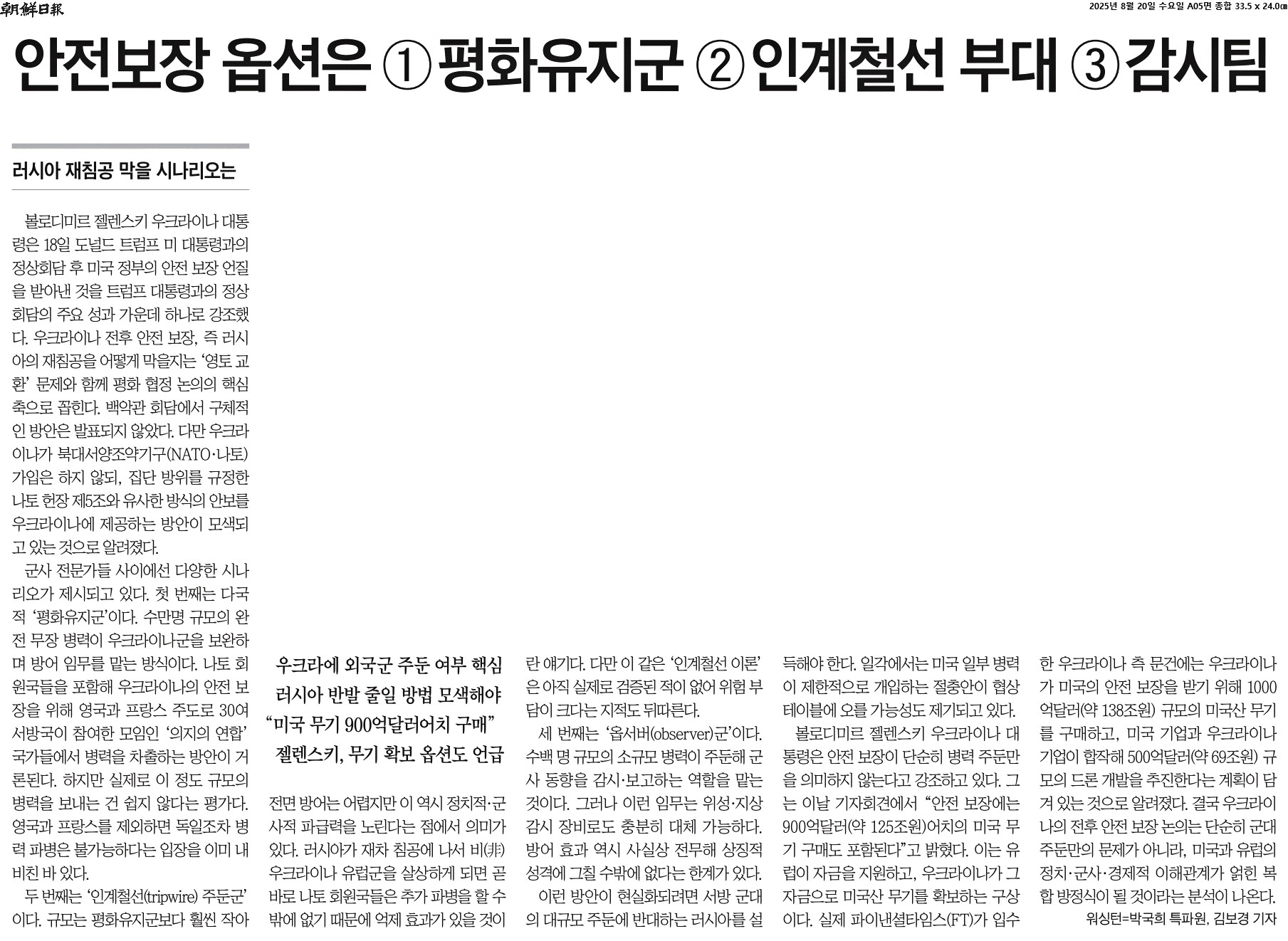① 볼로디미르 젤렌스키 우크라이나 대통령은 18일 도널드 트럼프 미 대통령과의 정상회담 후 미국 정부의 안전 보장 언질을 받아낸 것을 트럼프 대통령과의 정상회담의 주요 성과 가운데 하나로 강조했다. 우크라이나 전후 안전 보장, 즉 러시아의 재침공을 어떻게 막을지는 ‘영토 교환’ 문제와 함께 평화 협정 논의의 핵심 축으로 꼽힌다.
