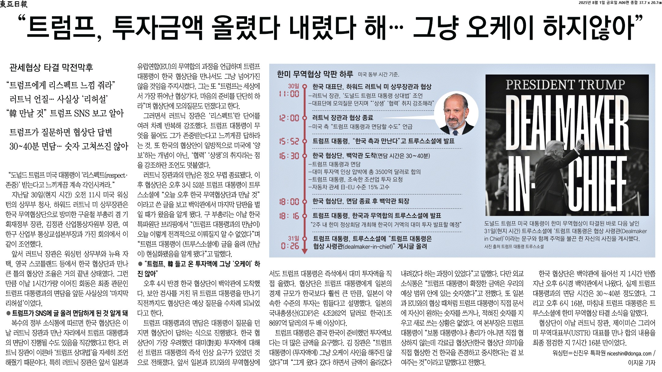 ⑤ 다만 외교 소식통은 “트럼프 대통령이 확정한 금액은 우리의 예상 범위 안에 있는 숫자였다”고 전했다. 또 일본과 EU와의 협상 때처럼 트럼프 대통령이 직접 문서에 자신이 원하는 숫자를 쓰거나, 적혀진 숫자를 지우고 새로 쓰는 상황은 없었다. 여 본부장은 트럼프 대통령이 “보통 대통령이나 총리가 아니면 직접 협상하지 않는데 각료급 협상단(한국 협상단 의미)을 직접 협상한 건 한국을 존경하고 중시한다는 걸 보여주는 것”이라고 말했다고 전했다.