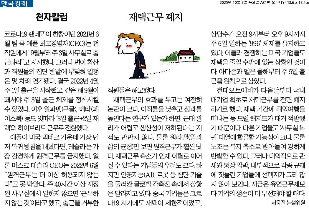 ⑤ 현대오토에버가 다음달부터 국내 대기업 최초로 재택근무를 전면 폐지하기로 했다. 재택 기간에 해외여행을 떠나는 등 모럴 해저드가 대거 적발됐기 때문이다. 다른 기업들도 ‘사무실 복귀’ 대열에 합류할 가능성이 크다. 물론 노조는 복지 축소로 받아들여 강하게 반발할 수 있다. 그러나 대외적으로 관세와 통상 압박, 내부적으로 각종 규제에 짓눌린 기업들에 선택지가 그리 많지 않아 보인다. 지금은 유연근무제보다 기업의 생존이 더 우선돼야 할 때다.