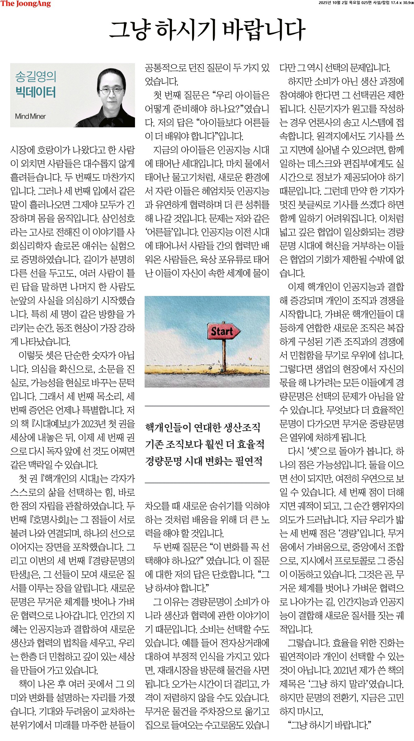 ② 이렇듯 셋은 단순한 숫자가 아닙니다. 의심을 확신으로, 소문을 진실로, 가능성을 현실로 바꾸는 문턱입니다. 그래서 세 번째 목소리, 세 번째 증언은 언제나 특별합니다. 저의 책 『시대예보』가 2023년 첫 권을 세상에 내놓은 뒤, 이제 세 번째 권으로 다시 독자 앞에 선 것도 어쩌면 같은 맥락일 수 있습니다.