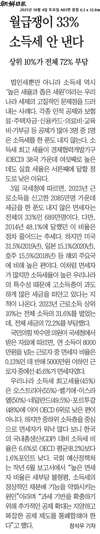 ③ 이처럼 면세자가 많지만 소득세율이 높은 우리나라의 특수성 때문에 고소득층이 과도하게 많은 세금을 떠안고 있다는 지적이 나온다. 2023년 근로소득 상위 10%는 전체 소득의 31.6%를 벌었는데, 전체 세금의 72.2%를 부담했다.