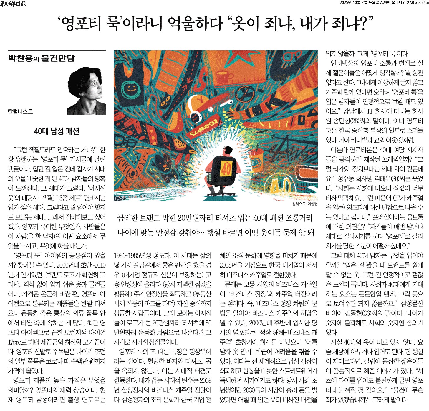 사실 40대의 옷이 따로 있지 않다. 요즘 세상에 아무거나 입어도 된다. 단 행실이 제대로라면. 칼럼에 등장한 젊은이들이 공통적으로 해준 이야기가 있다. “셔츠에 타이를 입어도 불편하게 굴면 영포티라 느껴질 것 같아요.” “물건에 무슨 죄가 있겠습니까?” 그러게 말이다.