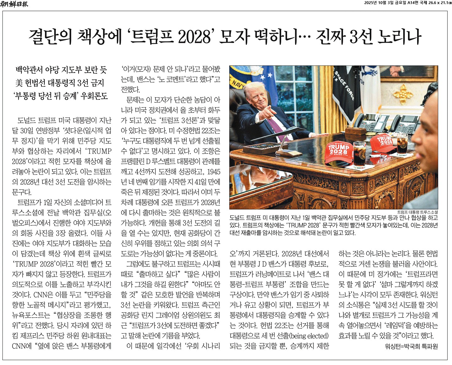 ① 도널드 트럼프 미국 대통령이 지난달 30일 연방정부 ‘셧다운(일시적 업무 정지)’을 막기 위해 민주당 지도부와 협상하는 자리에서 ‘TRUMP 2028’이라고 적힌 모자를 책상 위에 올려놓아 논란이 되고 있다. 이는 트럼프의 2028년 대선 3선 도전을 암시하는 문구다.