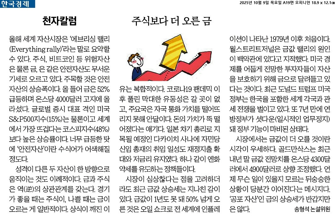 ② 주목할 것은 안전자산의 상승폭이다. 올 들어 금은 52% 급등하며 온스당 4000달러 고지에 올라섰다. 글로벌 증시 대표 격인 미국 S&P500지수(15%)는 물론이고 세계에서 가장 뜨겁다는 코스피지수(48%)보다 높은 상승률이다. 너무 급등한 탓에 ‘안전자산’이란 수식어가 어색해질 정도다.
