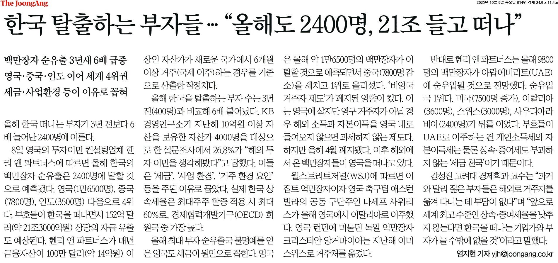 ① 8일 영국의 투자이민 컨설팅업체 헨리 앤 파트너스에 따르면 올해 한국의 백만장자 순유출은 2400명에 달할 것으로 예측됐다. 영국(1만6500명), 중국(7800명), 인도(3500명) 다음으로 4위다. 부호들이 한국을 떠나면서 152억 달러(약 21조3000억원) 상당의 자금 유출도 예상된다.