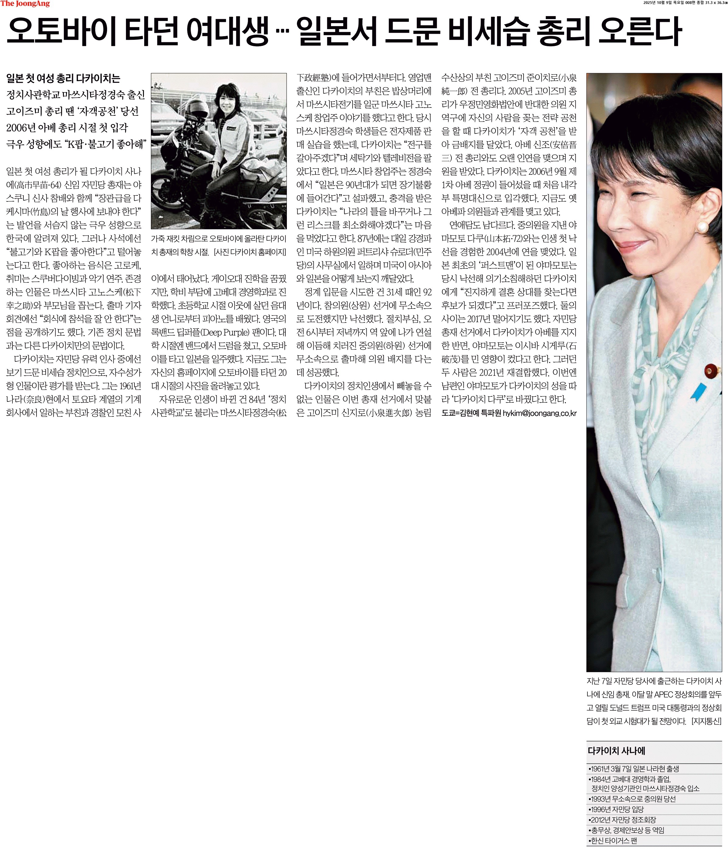 ① 일본 첫 여성 총리가 될 다카이치 사나에(高市早苗·64) 신임 자민당 총재는 야스쿠니 신사 참배와 함께 “장관급을 다케시마(竹島)의 날 행사에 보내야 한다”는 발언을 서슴지 않는 극우 성향으로 한국에 알려져 있다. 그러나 사석에선 “불고기와 K팝을 좋아한다”고 털어놓는다고 한다. 좋아하는 음식은 고로케, 취미는 스쿠버다이빙과 악기 연주. 존경하는 인물은 마쓰시타 고노스케(松下幸之助)와 부모님을 꼽는다.