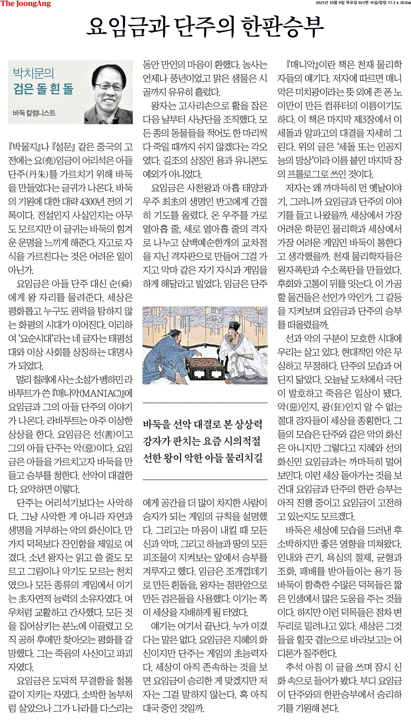 ③ 멀리 칠레에 사는 소설가 벵하민 라바투트가 쓴 『매니악(MANIAC)』에 요임금과 그의 아들 단주의 이야기가 나온다. 라바투트는 아주 이상한 상상을 한다. 요임금은 선(善)이고 그의 아들 단주는 악(惡)이다. 요임금은 아들을 가르치고자 바둑을 만들고 승부를 청한다. 선악이 대결한다.