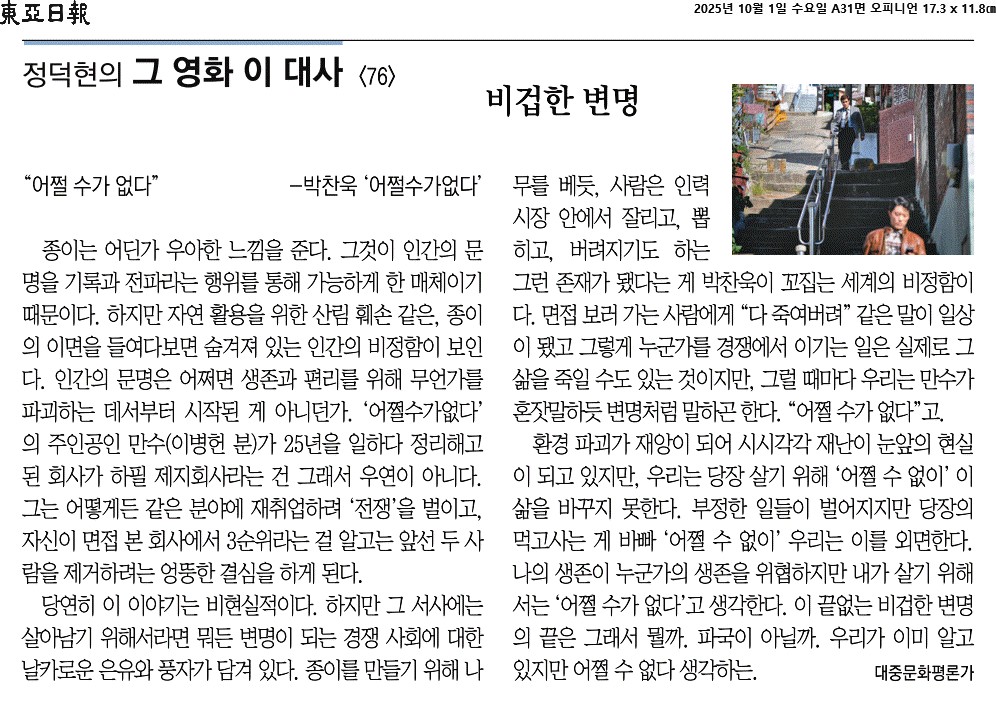 ② ‘어쩔수가없다’의 주인공인 만수(이병헌 분)가 25년을 일하다 정리해고된 회사가 하필 제지회사라는 건 그래서 우연이 아니다. 그는 어떻게든 같은 분야에 재취업하려 ‘전쟁’을 벌이고, 자신이 면접 본 회사에서 3순위라는 걸 알고는 앞선 두 사람을 제거하려는 엉뚱한 결심을 하게 된다.