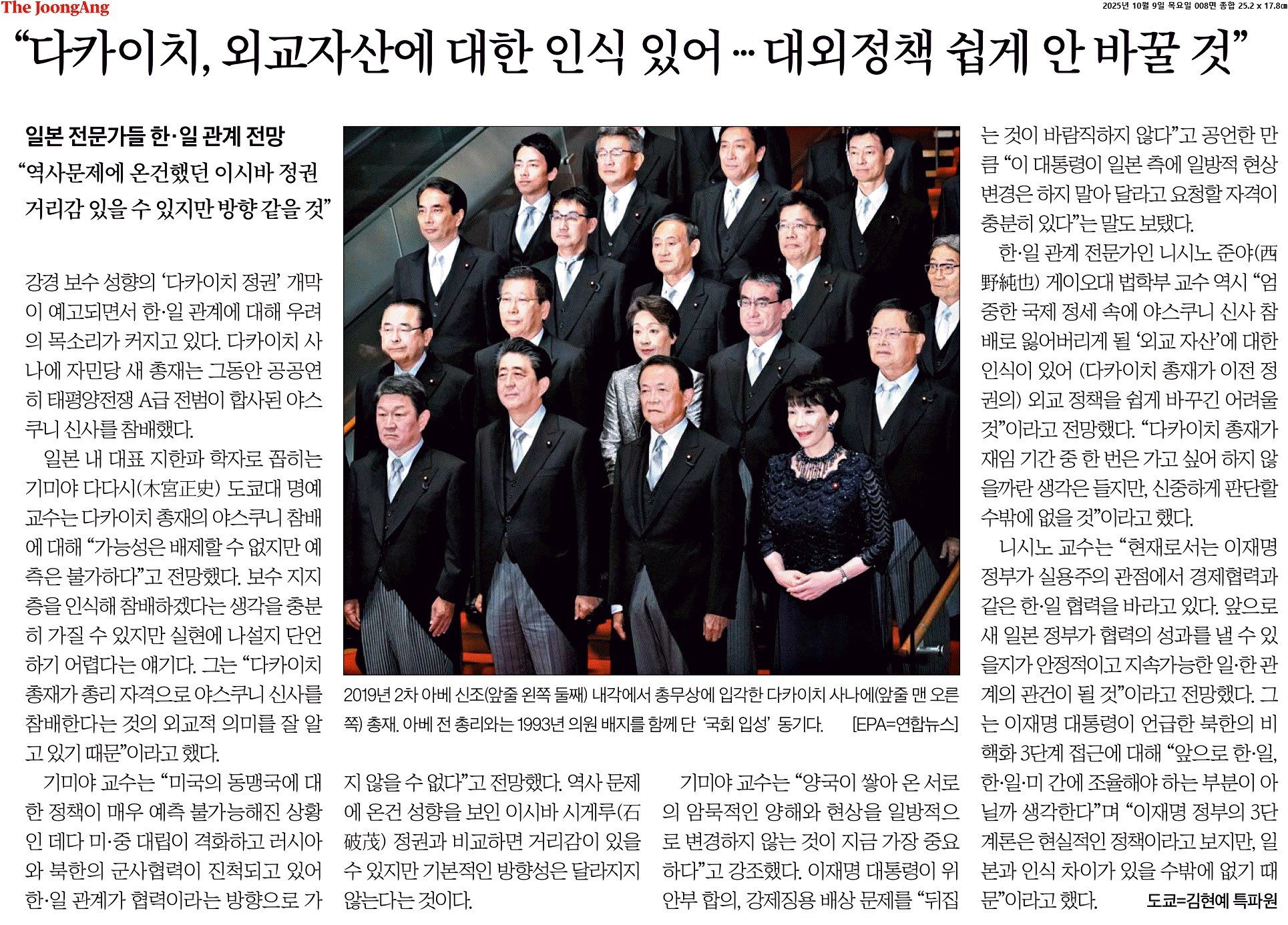③ 기미야 교수는 “현재의 국제 정세를 놓고 보면 한·일이 역사 문제만으로 다툴 여유가 없다”고 지적했다. “미국의 동맹국에 대한 정책이 매우 예측 불가능해진 상황인 데다 미·중 대립이 격화하고 러시아와 북한의 군사 협력이 진척되고 있어 한·일 관계가 협력이라는 방향으로 가지 않을 수 없다”고 전망했다. 역사 문제에 온건적 성향을 보인 이시바 시게루(石破茂) 정권과 비교하면 ‘거리감’이 있을 수 있지만 기본적인 방향성은 달라지지 않는다는 것이다.
