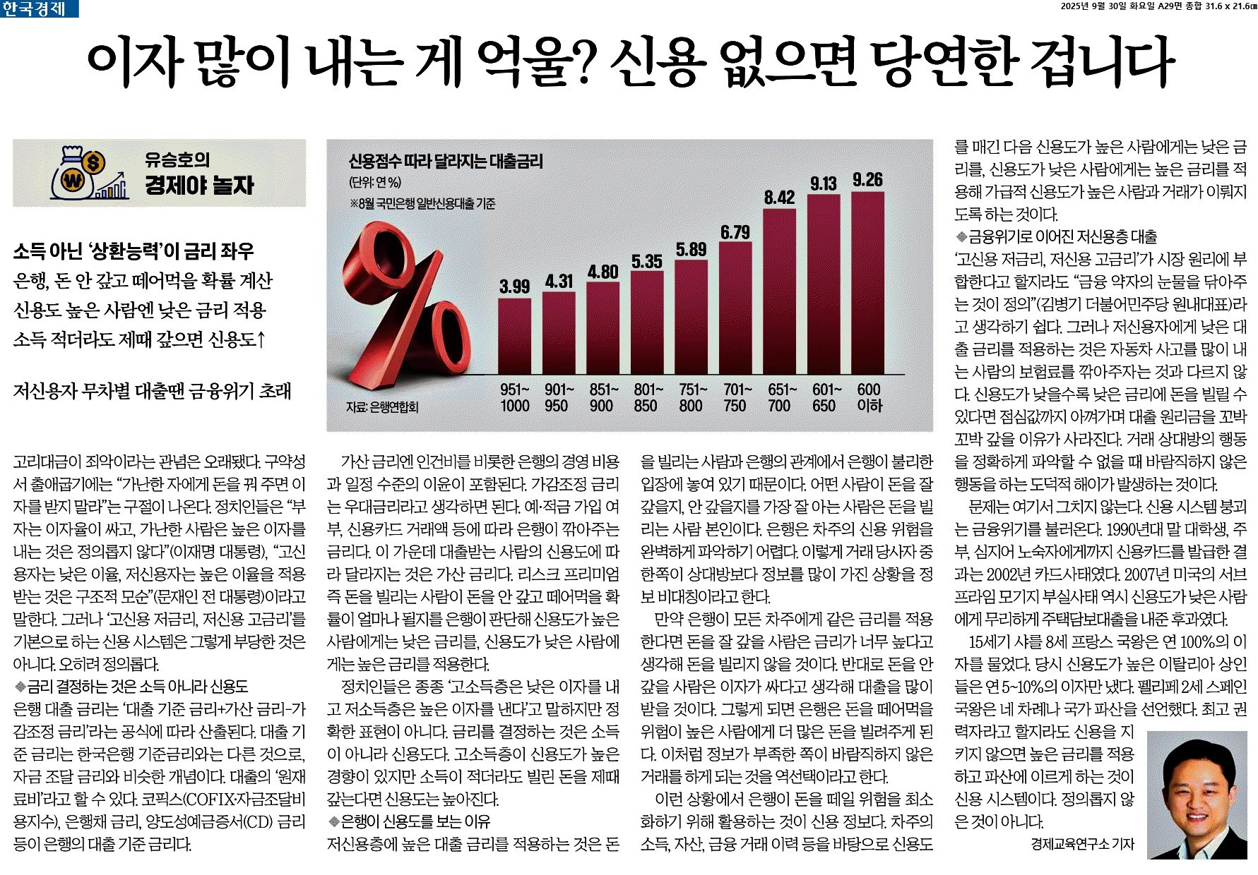 ① 고리대금이 죄악이라는 관념은 오래됐다. 구약성서 출애굽기에는 “가난한 자에게 돈을 꿔 주면 이자를 받지 말라”는 구절이 나온다. 정치인들은 “부자는 이자율이 싸고, 가난한 사람은 높은 이자를 내는 것은 정의롭지 않다”(이재명 대통령), “고신용자는 낮은 이율, 저신용자는 높은 이율을 적용받는 것은 구조적 모순”(문재인 전 대통령)이라고 말한다. 그러나 ‘고신용 저금리, 저신용 고금리’를 기본으로 하는 신용 시스템은 그렇게 부당한 것은 아니다. 오히려 정의롭다.