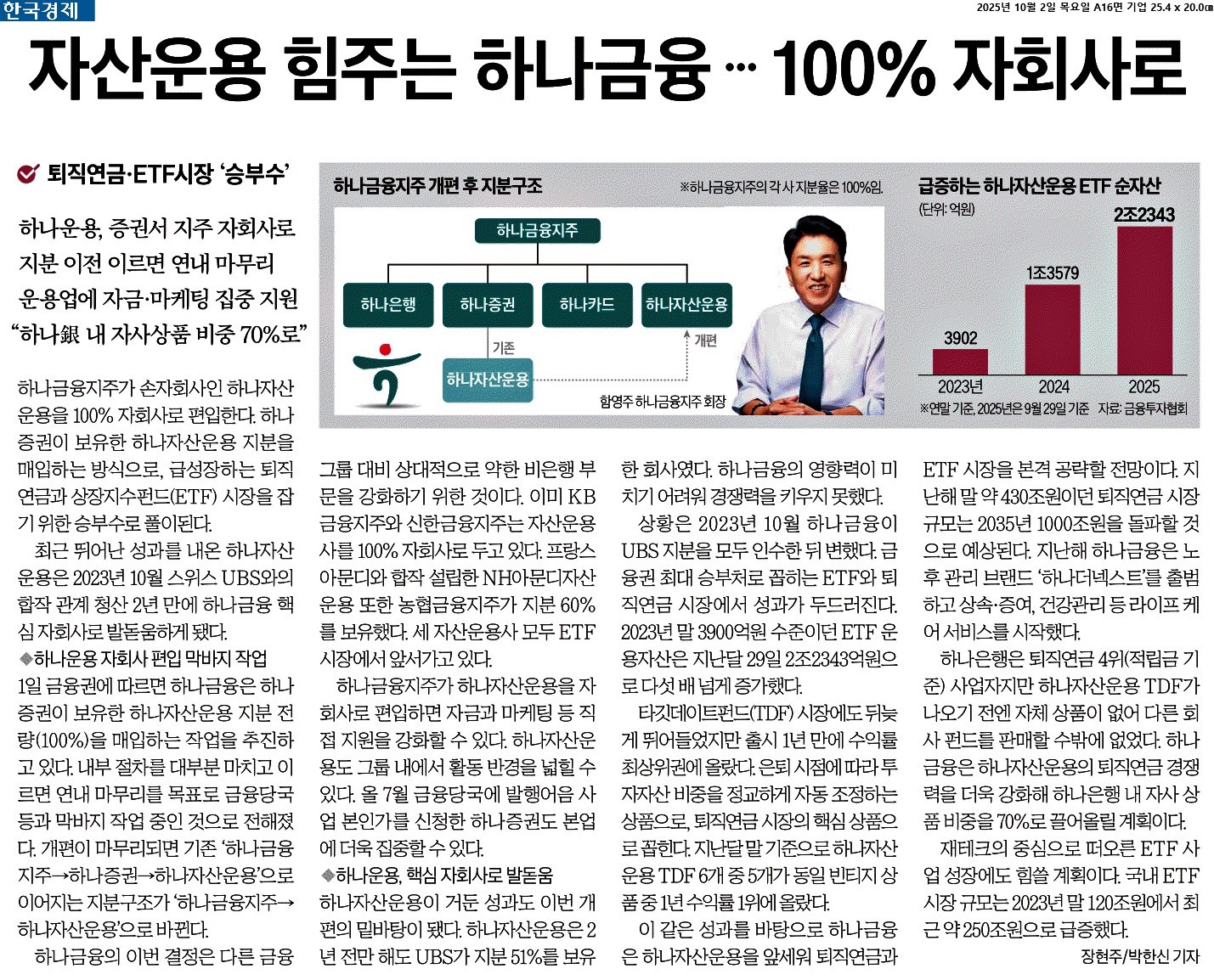 ① 하나금융지주가 손자회사인 하나자산운용을 100% 자회사로 편입한다. 하나증권이 보유한 하나자산운용 지분을 매입하는 방식으로, 급성장하는 퇴직연금과 상장지수펀드(ETF) 시장을 잡기 위한 승부수로 풀이된다.