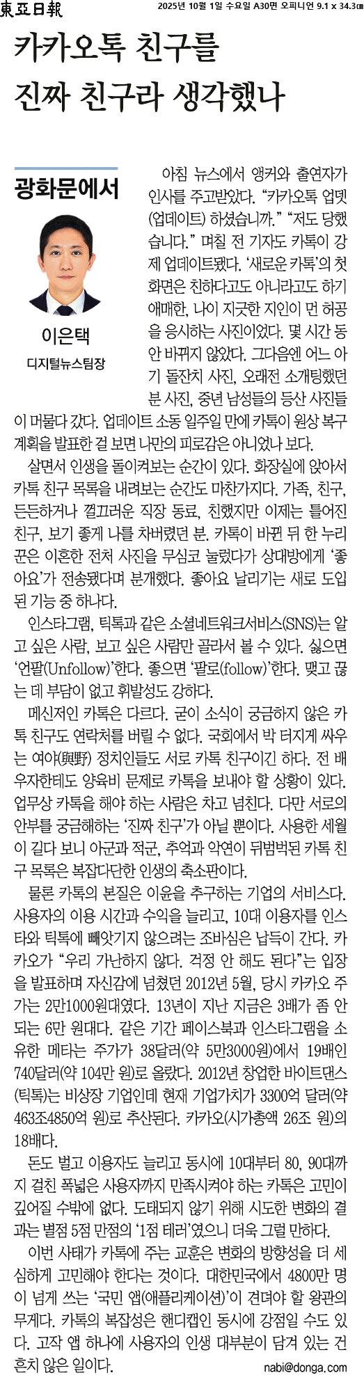 ⑤ 이번 사태가 카톡에 주는 교훈은 변화의 방향성을 더 세심하게 고민해야 한다는 것이다. 대한민국에서 4800만 명이 넘게 쓰는 ‘국민 앱(애플리케이션)’이 견뎌야 할 왕관의 무게다. 카톡의 복잡성은 핸디캡인 동시에 강점일 수도 있다. 고작 앱 하나에 사용자의 인생 대부분이 담겨 있는 건 흔치 않은 일이다.