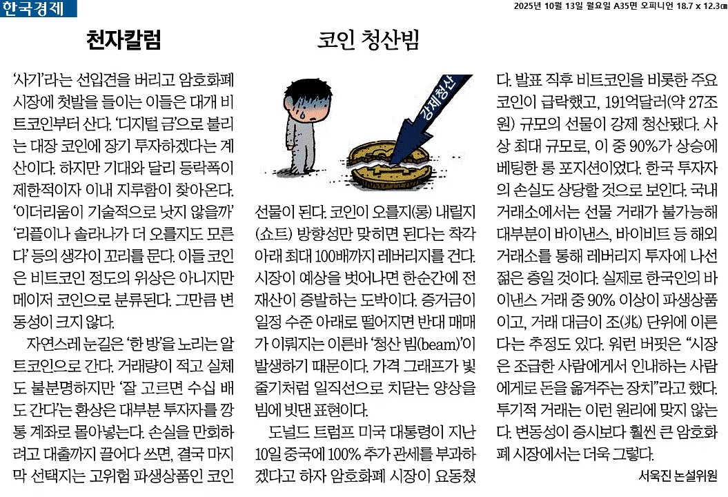 ② 자연스레 눈길은 ‘한 방’을 노리는 알트코인으로 간다. 거래량이 적고 실체도 불분명하지만 ‘잘 고르면 수십 배도 간다’는 환상은 대부분 투자자를 깡통 계좌로 몰아넣는다. 손실을 만회하려고 대출까지 끌어다 쓰면, 결국 마지막 선택지는 고위험 파생상품인 코인 선물이 된다.