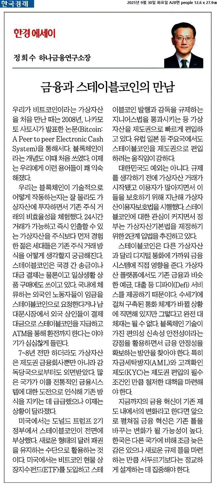 ③ 미국에서는 도널드 트럼프 2기 정부에서 스테이블코인이 전면에 부상했다. 새로운 형태의 달러 패권을 유지하는 수단으로 활용하는 것이다. 미국에서는 비트코인 현물 상장지수펀드(ETF)를 도입하고 스테이블코인 발행과 감독을 규제하는 지니어스법을 통과시키는 등 가상자산을 제도권으로 빠르게 편입하고 있다. 유럽 일본 등 주요국에서도 스테이블코인을 제도권으로 편입하려는 움직임이 강하다.