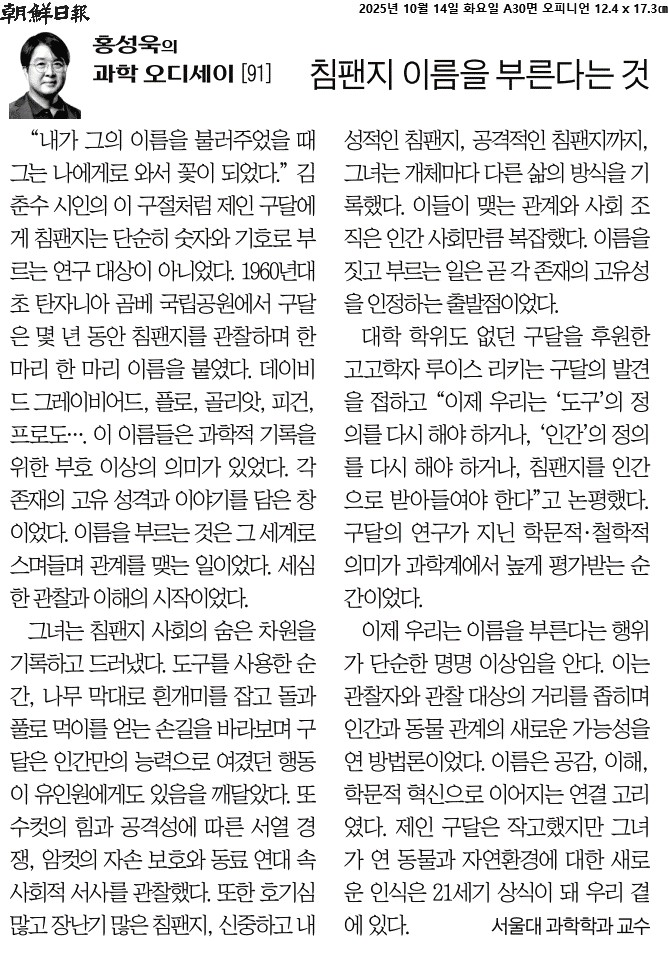 ⑤ 이제 우리는 이름을 부른다는 행위가 단순한 명명 이상임을 안다. 이는 관찰자와 관찰 대상의 거리를 좁히며 인간과 동물 관계의 새로운 가능성을 연 방법론이었다. 이름은 공감, 이해, 학문적 혁신으로 이어지는 연결 고리였다. 제인 구달은 작고했지만 그녀가 연 동물과 자연환경에 대한 새로운 인식은 21세기 상식이 돼 우리 곁에 있다.