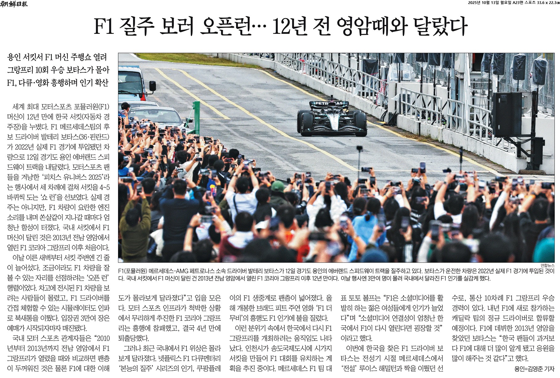 ① 세계 최대 모터스포츠 포뮬러원(F1) 머신이 12년 만에 한국 서킷(자동차 경주장)을 누볐다. F1 메르세데스팀의 후보 드라이버 발테리 보타스(36·핀란드)가 2022년 실제 F1 경기에 투입됐던 차량으로 12일 경기도 용인 에버랜드 스피드웨이 트랙을 내달렸다. 모터스포츠 팬들을 겨냥한 ‘피치스 유니버스 2025’라는 행사에서 세 차례에 걸쳐 서킷을 4~5바퀴씩 도는 ‘쇼 런’을 선보였다. 실제 경주는 아니지만, F1 차량이 요란한 엔진 소리를 내며 쏜살같이 지나갈 때마다 엄청난 함성이 터졌다. 국내 서킷에서 F1 머신이 달린 것은 2013년 전남 영암에서 열린 F1 코리아 그랑프리 이후 처음이다.