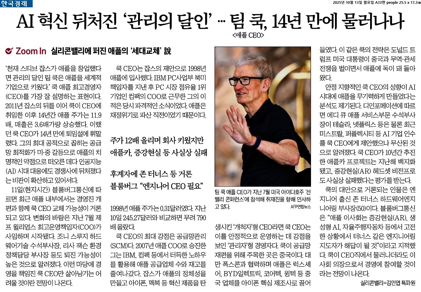 ② 2011년 잡스의 뒤를 이어 쿡이 CEO에 취임한 이후 14년간 애플 주가는 11.9배, 매출은 3.6배가량 상승했다. 이랬던 쿡 CEO가 14년 만에 퇴임설에 휘말렸다. 그의 최대 공적으로 꼽히는 공급망 최적화가 미·중 갈등으로 애플의 치명적인 약점으로 떠오른 데다 인공지능(AI) 시대 대응에도 경쟁사에 뒤처졌다는 비판이 확산하고 있어서다.