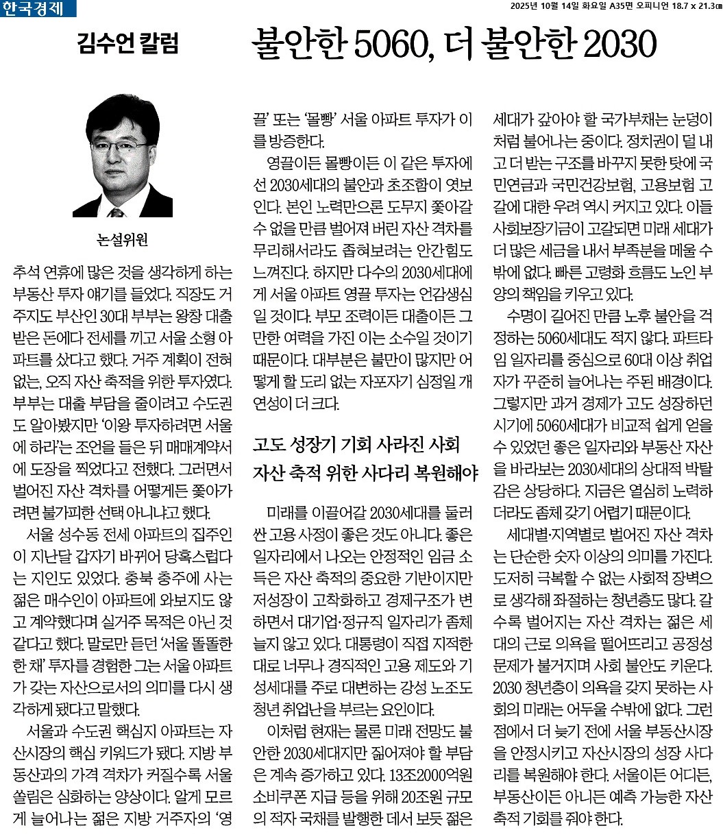 ① 추석 연휴에 많은 것을 생각하게 하는 부동산 투자 얘기를 들었다. 직장도 거주지도 부산인 30대 부부는 왕창 대출받은 돈에다 전세를 끼고 서울 소형 아파트를 샀다고 했다. 거주 계획이 전혀 없는, 오직 자산 축적을 위한 투자였다. 부부는 대출 부담을 줄이려고 수도권도 알아봤지만 ‘이왕 투자하려면 서울에 하라’는 조언을 들은 뒤 매매계약서에 도장을 찍었다고 전했다. 그러면서 벌어진 자산 격차를 어떻게든 쫓아가려면 불가피한 선택 아니냐고 했다.