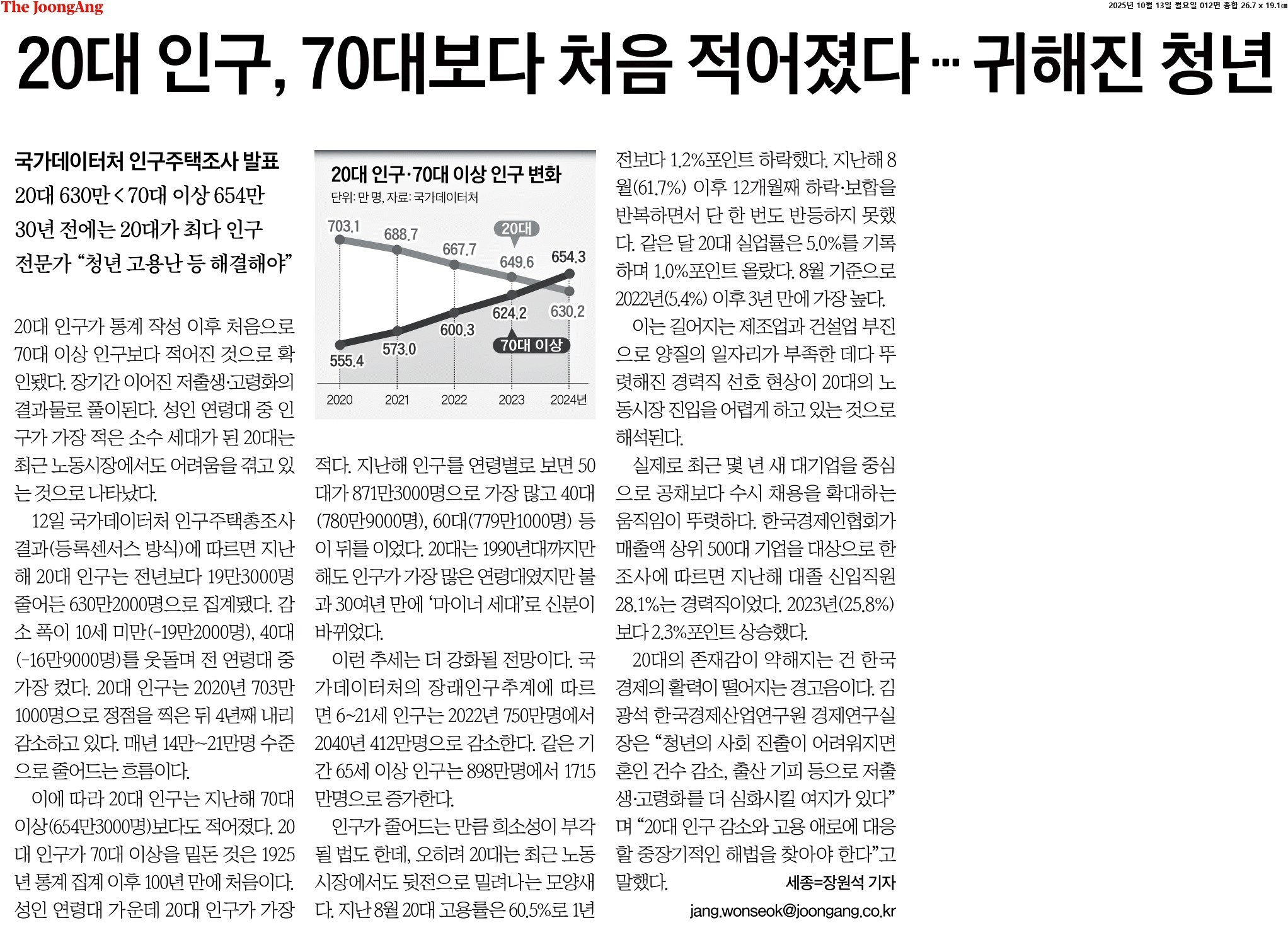 ⑤ 20대의 존재감이 약해지는 건 한국 경제의 활력이 떨어지는 경고음이다. 김광석 한국경제산업연구원 경제연구실장은 “청년의 사회 진출이 어려워지면 혼인 건수 감소, 출산 기피 등으로 저출생·고령화를 더 심화시킬 여지가 있다”며 “20대 인구 감소와 고용 애로에 대응할 중장기적인 해법을 찾아야 한다”고 말했다.