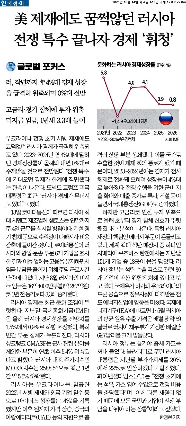 ① 우크라이나 전쟁 초기 서방 제재에도 끄떡없던 러시아 경제가 급격히 위축되고 있다. 2023~2024년 연 4%대에 달하던 경제성장률이 올해와 내년 0%대로 주저앉을 것으로 전망된다. ‘전쟁 특수’에 기대오던 경제가 한계에 직면했다는 관측이 나온다. 도널드 트럼프 미국 대통령은 최근 “러시아 경제가 무너지고 있다”고 했다.
