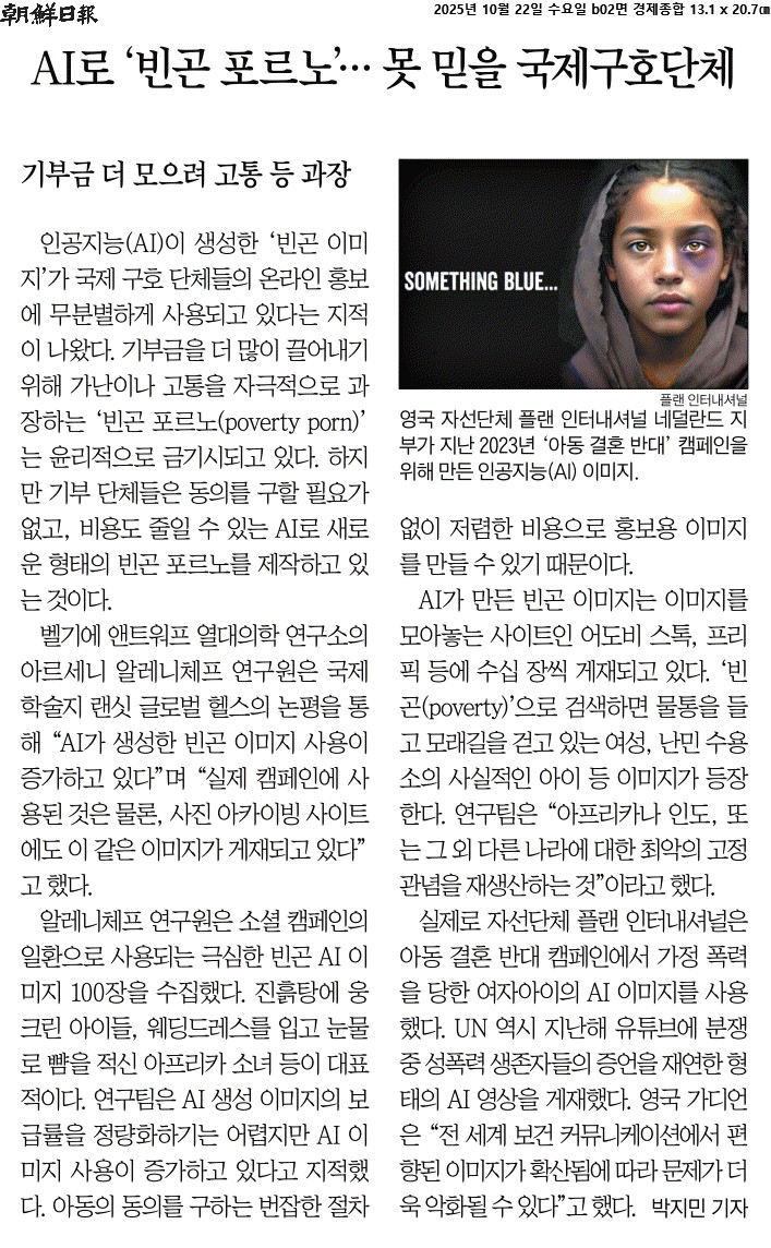 ② 알레니체프 연구원은 소셜 캠페인의 일환으로 사용되는 극심한 빈곤 AI 이미지 100장을 수집했다. 진흙탕에 웅크린 아이들, 웨딩드레스를 입고 눈물로 뺨을 적신 아프리카 소녀 등이 대표적이다. 연구팀은 AI 생성 이미지의 보급률을 정량화하기는 어렵지만 AI 이미지 사용이 증가하고 있다고 지적했다. 아동의 동의를 구하는 번잡한 절차 없이 저렴한 비용으로 홍보용 이미지를 만들 수 있기 때문이다.