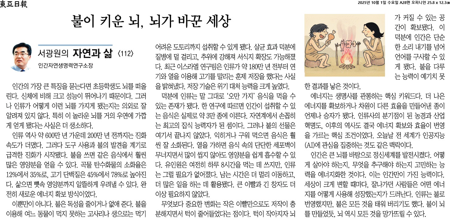 ① 인류 역사 약 600만 년 가운데 200만 년 전까지는 진화 속도가 더뎠다. 그러다 도구 사용과 불의 발견을 계기로 급격한 진화가 시작됐다. 불을 쓰면 같은 음식에서 훨씬 많은 영양분을 얻을 수 있다.