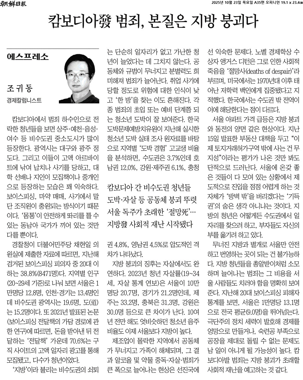 ⑤ 무너진 지방과 별개로 서울만 안전하고 번영하는 곳이 되는 건 불가능하다. 지방 청년들을 총알받이처럼 소모하며 늘어나는 범죄는 그 비용을 서울 사람들도 치러야 함을 명확히 보여준다. 지난해 20대 보이스피싱 피해자 통계를 보면, 서울은 1만명당 13.1명으로 전국 평균(9.0명)을 뛰어넘는다.