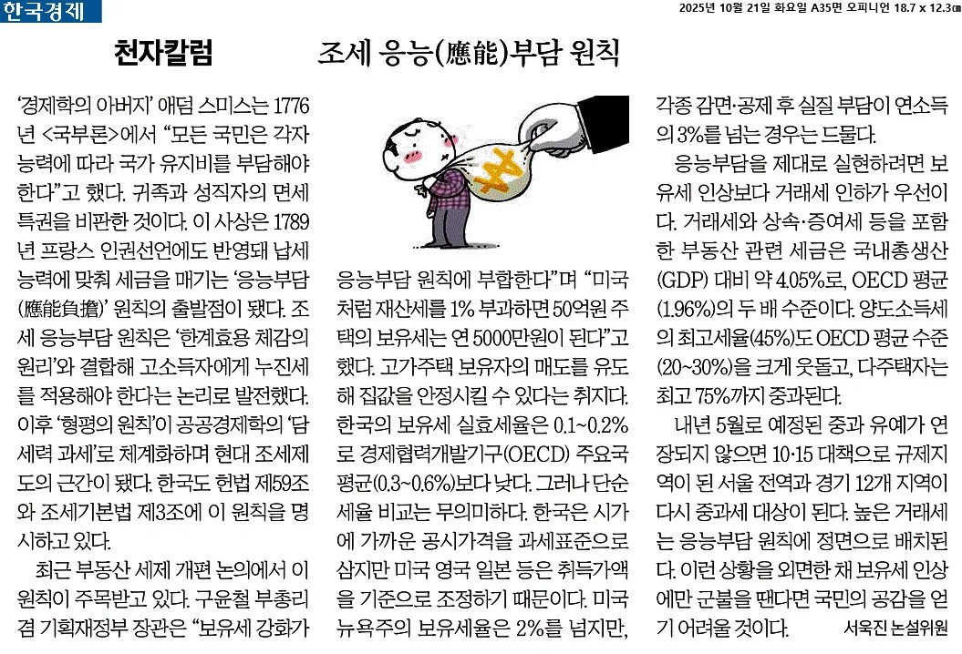 ④ 응능부담을 제대로 실현하려면 보유세 인상보다 거래세 인하가 우선이다. 거래세와 상속·증여세 등을 포함한 부동산 관련 세금은 국내총생산(GDP) 대비 약 4.05%로, OECD 평균(1.96%)의 두 배 수준이다. 양도소득세의 최고세율(45%)도 OECD 평균 수준(20~30%)을 크게 웃돌고, 다주택자는 최고 75%까지 중과된다.