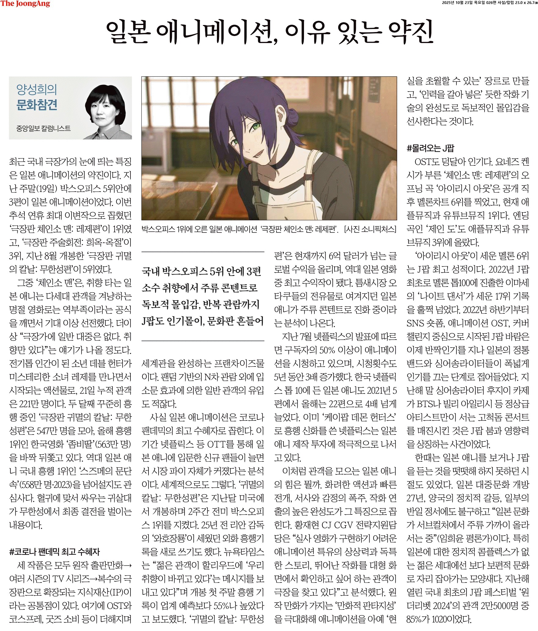 ① 최근 국내 극장가의 눈에 띄는 특징은 일본 애니메이션의 약진이다. 지난 주말(19일) 박스오피스 5위안에 3편이 일본 애니메이션이었다. 이번 추석 연휴 최대 이변작으로 꼽혔던 ‘극장판 체인소 맨: 레제편’이 1위였고, ‘극장판 주술회전: 희옥·옥절’이 3위, 지난 8월 개봉한 ‘극장판 귀멸의 칼날: 무한성편’이 5위였다.