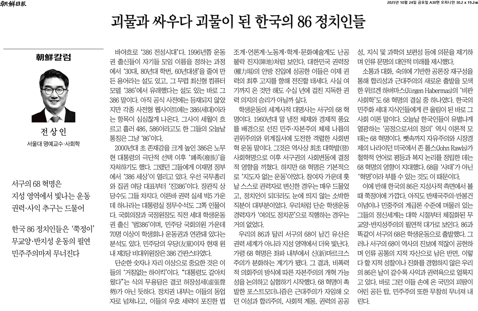 ⑤ 이에 반해 한국의 86은 지성사적 측면에서 볼 때 쭉정이에 가깝다. 아직도 반제국주의·반봉건 이념이나 민중주의 계급론 수준에 머물러 있는 그들의 정신세계는 대학 시절부터 체질화된 무교양·반지성주의의 필연적 대가로 보인다. 86과 똑같이 서구의 68은 학생운동으로 출발했다. 그러나 서구의 68이 역사의 진보에 적잖이 공헌하며 인류 공통의 지적 자산으로 남은 반면, 이렇다 할 지적 성찰이나 진화를 경험하지 않은 우리의 86은 날이 갈수록 사익과 권력욕으로 얼룩지고 있다.