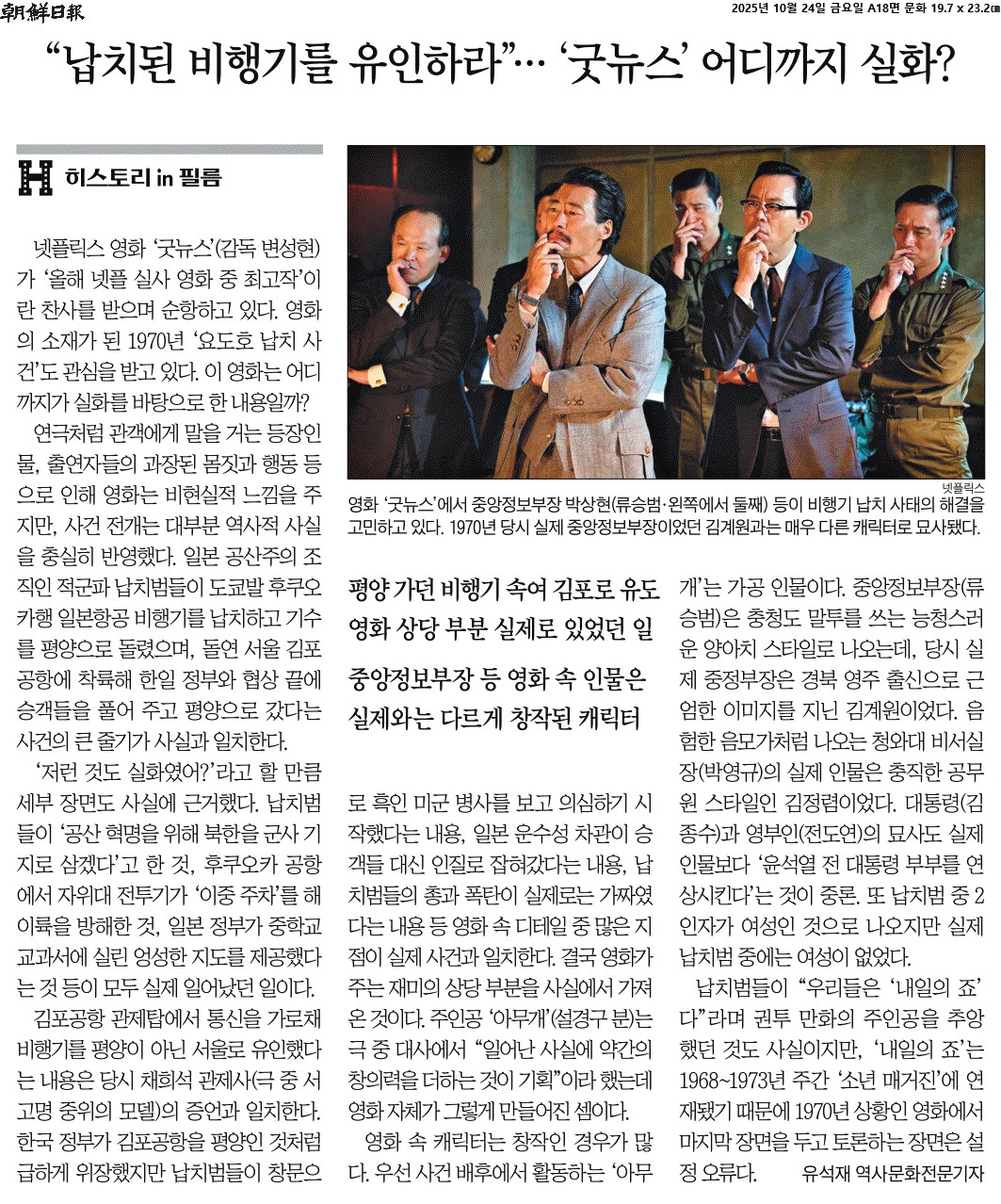 ① 넷플릭스 영화 ‘굿뉴스’(감독 변성현)가 시청자들로부터 ‘올해 넷플 실사 영화 중 최고작’이란 찬사를 받으며 순항하고 있다. 영화의 소재가 된 1970년 ‘요도호 납치 사건’도 새삼 관심을 받고 있다. 이 영화는 어디까지가 실화를 바탕으로 한 내용일까?