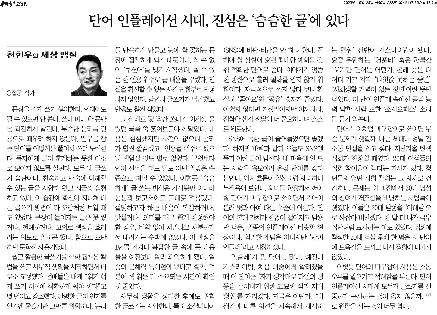 이렇듯 단어의 마구잡이 사용은 소통 오류를 일으키고 적대감을 부른다. 단어 인플레이션 시대에 모두가 글쓰기를 신중하게 구사하는 것이 옳지 않을까. 말로 원한을 사는 것이 너무 쉽다.