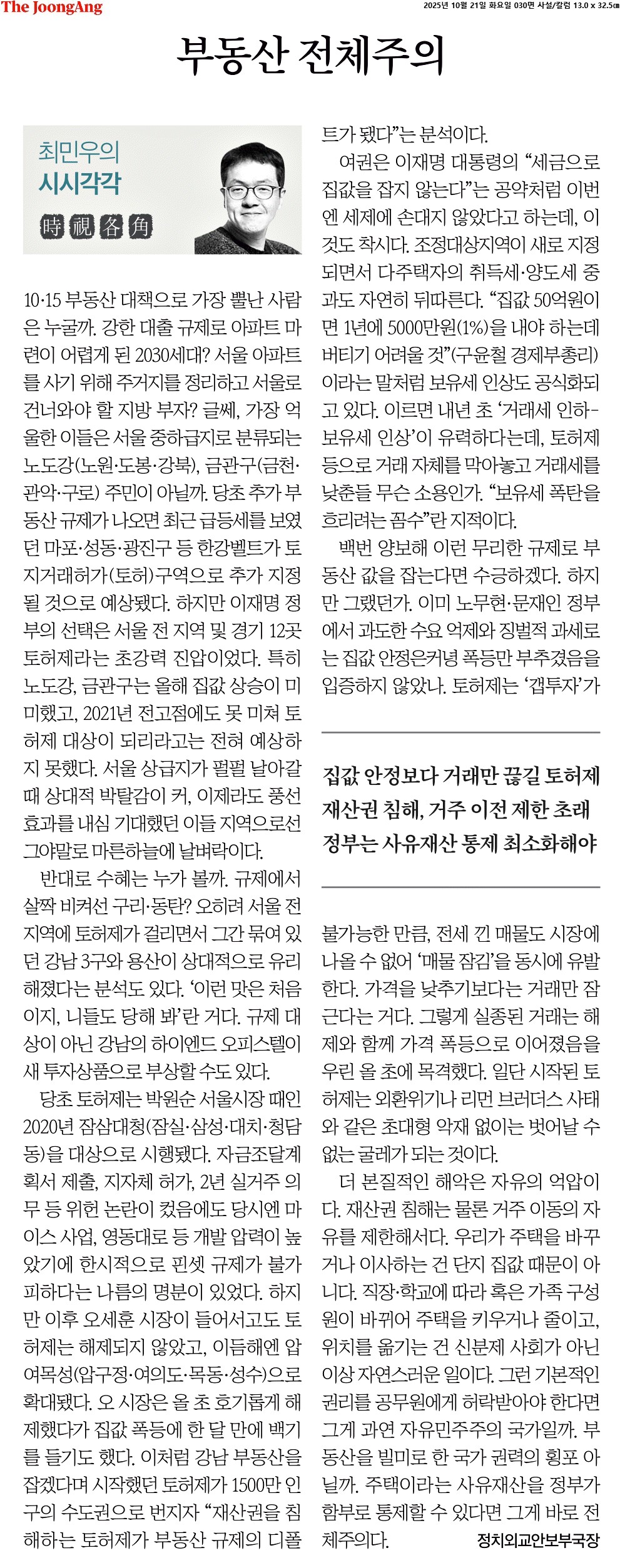 ⑤ 더 본질적인 해악은 자유의 억압이다. 재산권 침해는 물론 거주 이동의 자유를 제한해서다. 우리가 주택을 바꾸거나 이사를 하는 건 단지 집값 때문이 아니다. 직장·학교에 따라 혹은 가족 구성원이 바뀌어 주택을 키우거나 줄이고, 위치를 옮기는 건 신분제 사회가 아닌 이상 너무나 자연스러운 일이다. 그런 기본적인 권리를 공무원에게 허락받아야 한다면 그게 과연 자유민주주의 국가일까. 부동산을 빌미로 한 국가 권력의 횡포 아닐까. 주택이라는 사유재산을 정부가 함부로 통제할 수 있다면, 그게 바로 전체주의다.