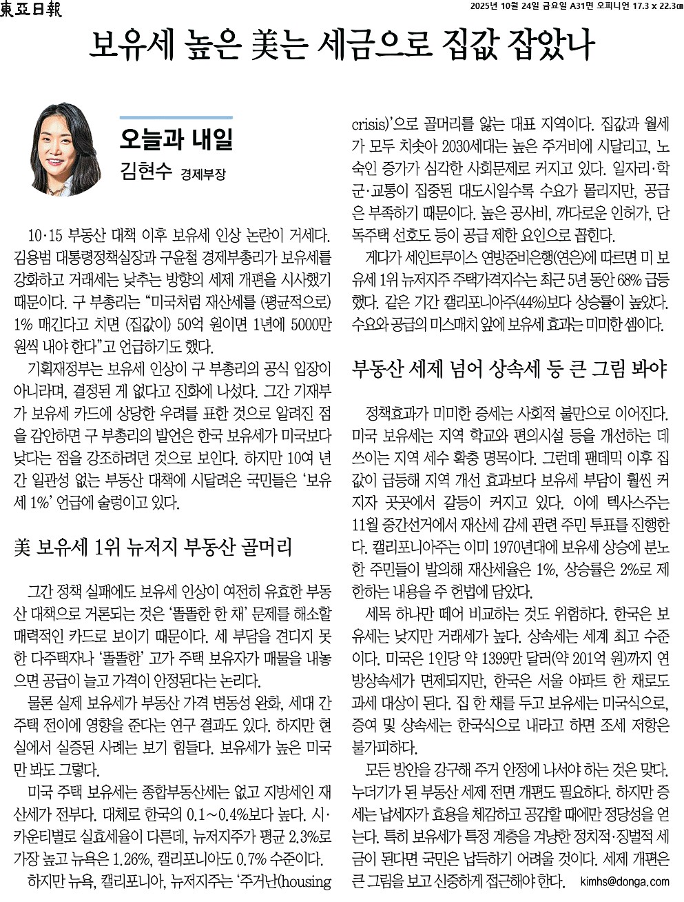 ① 10·15 부동산 대책 이후 보유세 인상 논란이 거세다. 김용범 대통령정책실장과 구윤철 경제부총리가 보유세를 강화하고 거래세는 낮추는 방향의 세제 개편을 시사했기 때문이다. 구 부총리는 “미국처럼 재산세를 (평균적으로) 1% 매긴다고 치면 (집값이) 50억 원이면 1년에 5000만 원씩 내야 한다”고 언급하기도 했다.