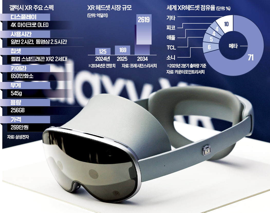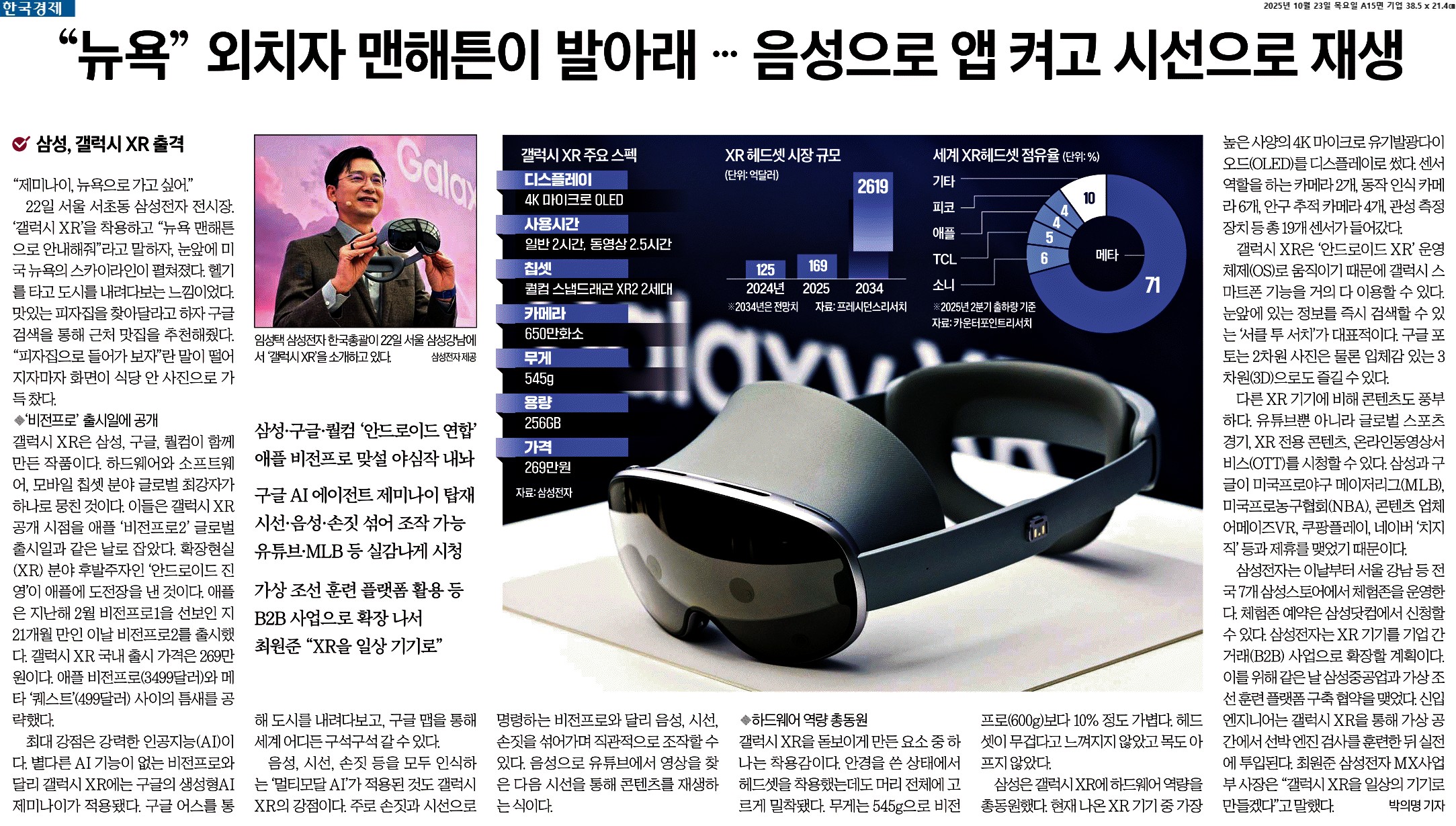 ② 삼성전자는 이날 서울 서초동 삼성강남에서 미디어 브리핑을 열고 갤럭시 XR을 공개했다. ‘안드로이드 XR’ 플랫폼을 기반으로 한 이 제품은 텍스트와 이미지, 음성, 영상, 동작 등 다양한 정보를 동시에 이해하고 처리하는 멀티모달 AI 기술이 적용된 게 특징이다. 이 덕분에 사용자는 음성, 시선, 손짓 등을 섞어가며 직관적으로 조작할 수 있다. 유튜브와 미국 메이저리그 등 다양한 콘텐츠를 즐길 수 있다. 국내 출시 가격은 269만원으로 애플 ‘비전프로’(3499달러·500만원)보다 싸지만, 메타 ‘퀘스트’(499달러·71만원)보다는 비싸다. 무게는 545g으로 비전프로(600g)보다 10% 정도 가볍다.