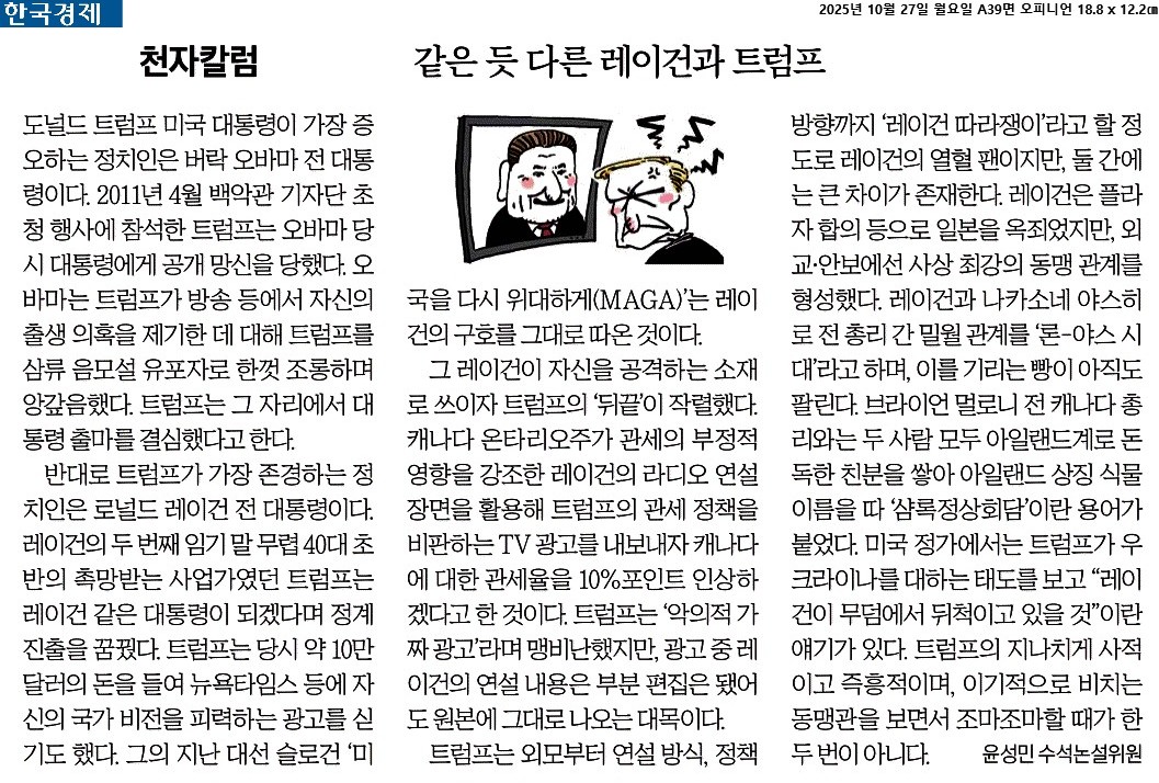 ⑤ 미국 정가에서는 트럼프가 우크라이나를 대하는 태도를 보고 “레이건이 무덤에서 뒤척이고 있을 것”이란 얘기가 있다. 트럼프의 지나치게 사적이고 즉흥적이며, 이기적으로 비치는 동맹관을 보면서 조마조마할 때가 한두 번이 아니다.