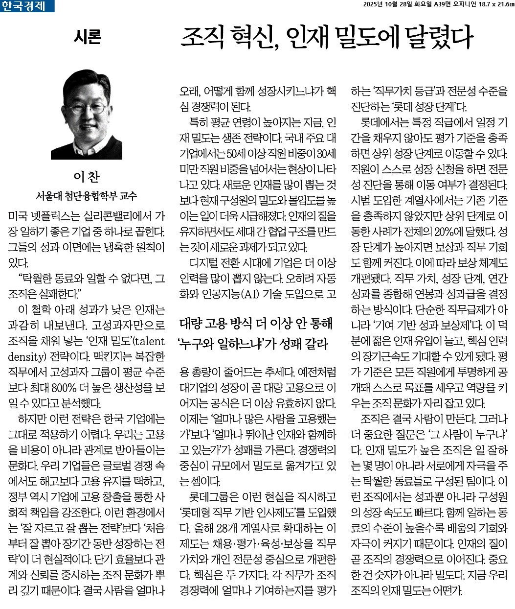 ⑤ 조직은 결국 사람이 만든다. 그러나 더 중요한 질문은 ‘그 사람이 누구냐’다. 인재 밀도가 높은 조직은 일 잘하는 몇 명이 아니라 서로에게 자극을 주는 탁월한 동료들로 구성된 팀이다. 이런 조직에서는 성과뿐 아니라 구성원의 성장 속도도 빠르다. 함께 일하는 동료의 수준이 높을수록 배움의 기회와 자극이 커지기 때문이다. 인재의 질이 곧 조직의 경쟁력으로 이어진다. 중요한 건 숫자가 아니라 밀도다. 지금 우리 조직의 인재 밀도는 어떤가.