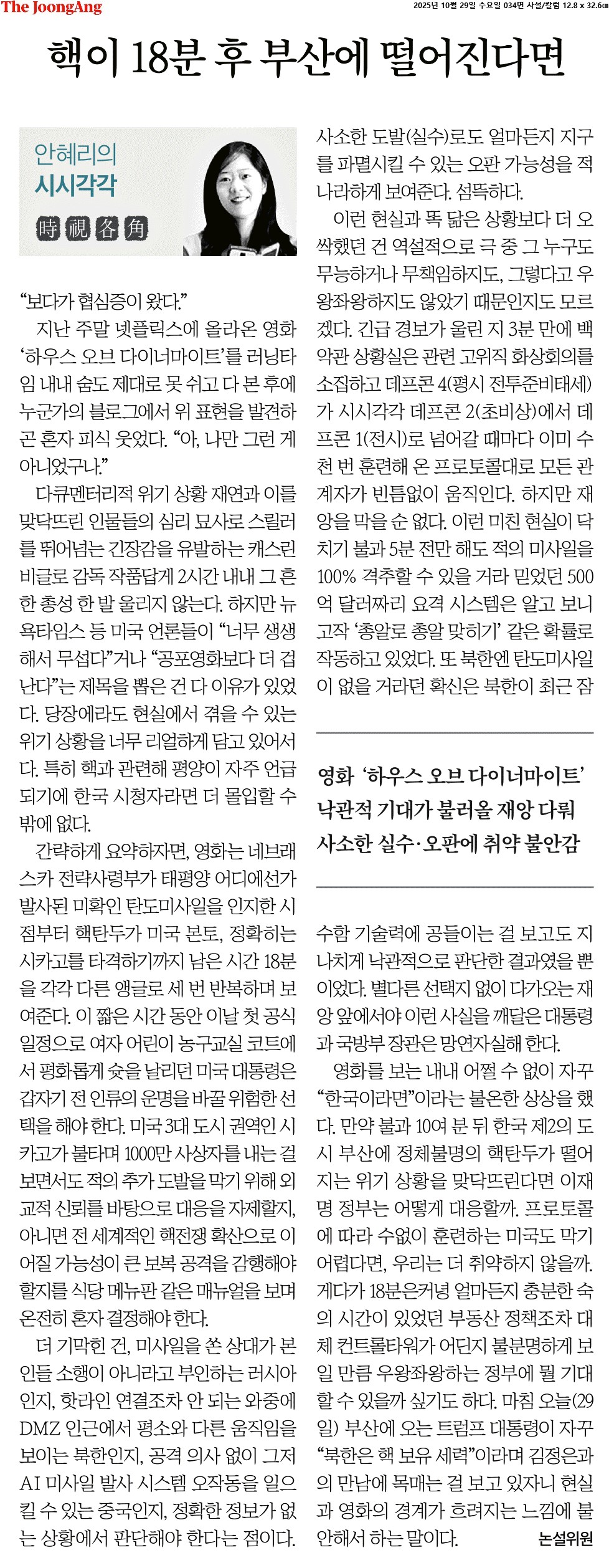 ② 다큐멘터리적 위기 상황 재연과 이를 맞닥뜨린 인물들의 심리 묘사로 스릴러를 뛰어넘는 긴장감을 유발하는 캐스린 비글로 감독 작품답게 2시간 내내 그 흔한 총성 한 발 울리지 않는다. 하지만 뉴욕타임스 등 미국 언론들이 "너무 생생해서 무섭다"라거나 "공포 영화보다 더 겁난다"는 제목을 뽑은 건 다 이유가 있었다. 당장에라도 현실에서 겪을 수 있는 위기 상황을 너무 리얼하게 담고 있어서다. 특히 핵과 관련해 평양이 자주 언급되기에 한국 시청자라면 더 몰입할 수밖에 없다.