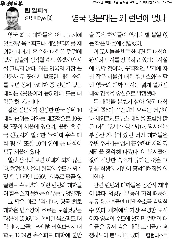 ① 영국 최고 대학들은 어느 도시에 있을까? 옥스퍼드나 케임브리지를 제외한 나머지 우수한 대학은 런던에 있지 않을까 생각할 수도 있겠지만 사실 그렇지 않다. 최근 영국의 가장 큰 신문사 두 곳에서 발표한 대학 순위를 보면 상위 25대학 중 런던에 있는 대학은 4곳뿐이며 톱5 안에 드는 대학은 하나뿐이다.