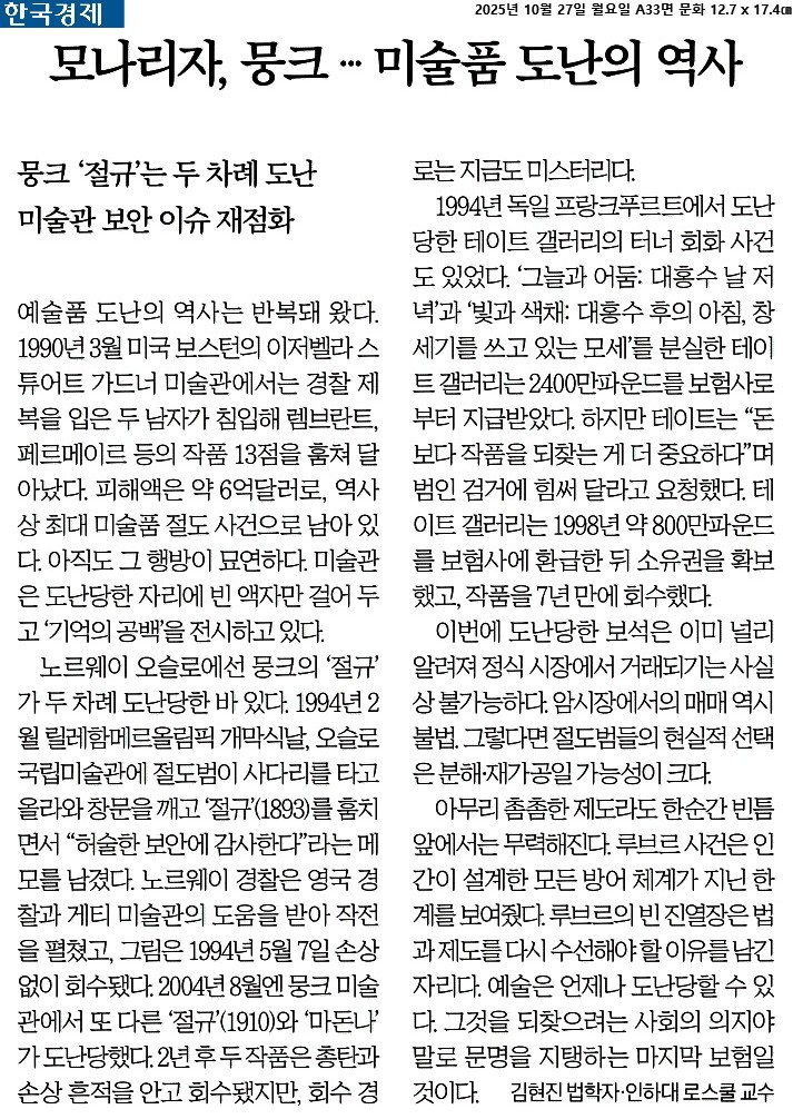 ⑤ 아무리 촘촘한 제도라도 한순간 빈틈 앞에서는 무력해진다. 루브르 사건은 인간이 설계한 모든 방어 체계가 지닌 한계를 보여줬다. 루브르의 빈 진열장은 법과 제도를 다시 수선해야 할 이유를 남긴 자리다. 예술은 언제나 도난당할 수 있다. 그것을 되찾으려는 사회의 의지야말로 문명을 지탱하는 마지막 보험일 것이다.