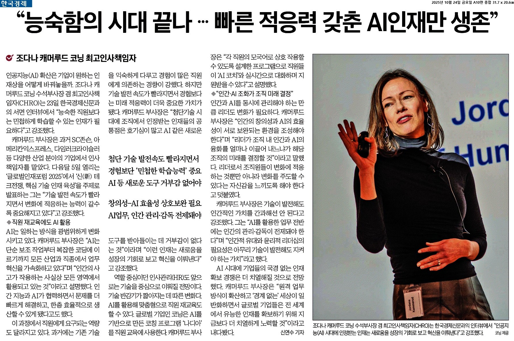 ① 인공지능(AI) 확산은 기업이 원하는 인재상을 어떻게 바꿔놓을까. 조다나 캐머루드 코닝 수석부사장 겸 최고인사책임자(CHRO)는 23일 한국경제신문과의 서면 인터뷰에서 “능숙한 직원보다는 민첩하게 학습할 수 있는 인재가 필요하다”고 강조했다.
