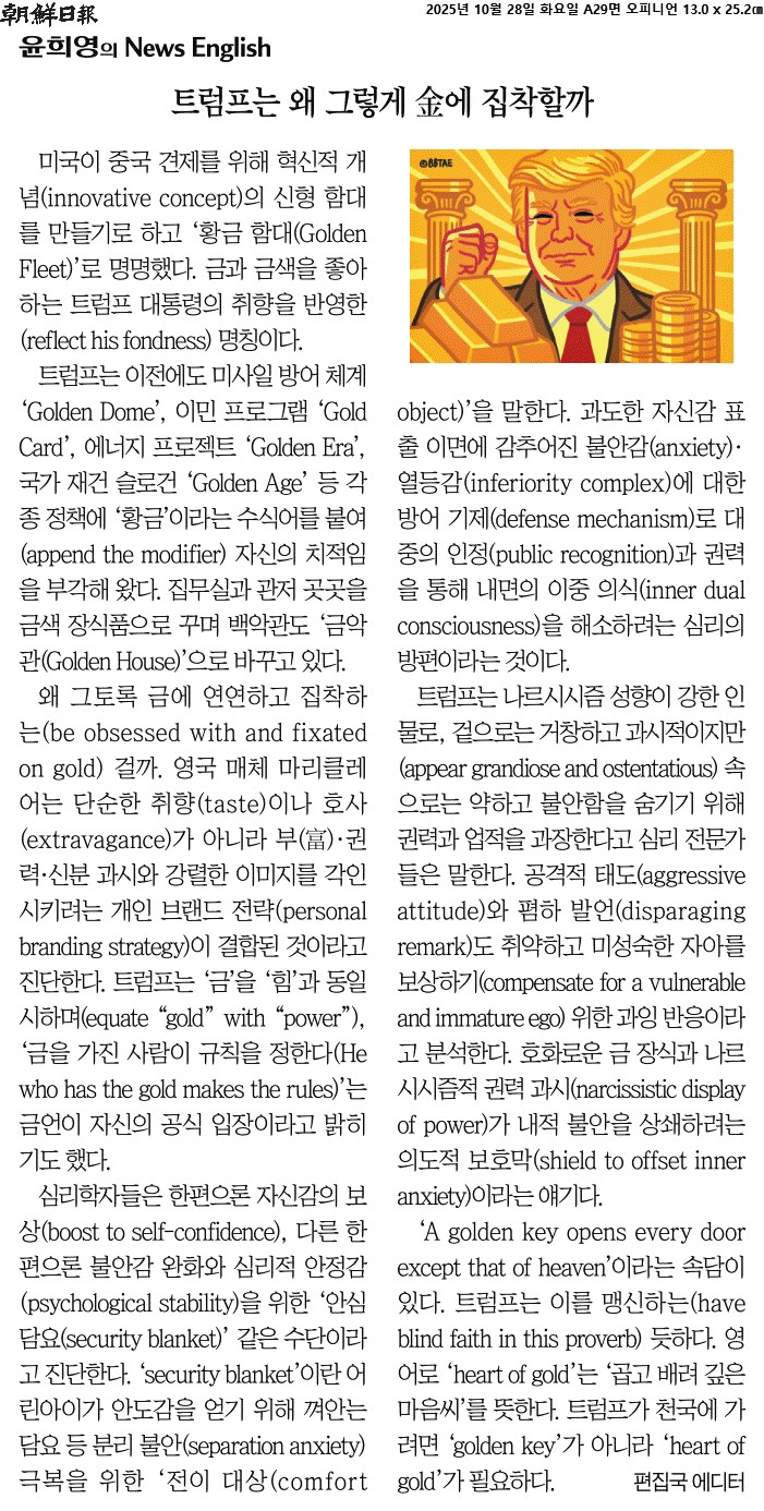 ③ 왜 그토록 금에 연연하고 집착하는(be obsessed with and fixated on gold) 걸까. 영국 매체 마리클레어는 단순한 취향(taste)이나 호사(extravagance)가 아니라 부(富)·권력·신분 과시와 강렬한 이미지를 각인시키려는 개인 브랜드 전략(personal branding strategy)이 결합된 것이라고 진단한다. 트럼프는 ‘금’을 ‘힘’과 동일시하며(equate “gold” with “power”), ‘금을 가진 사람이 규칙을 정한다(He who has the gold makes the rules)’는 금언이 자신의 공식 입장이라고 밝히기도 했다.
