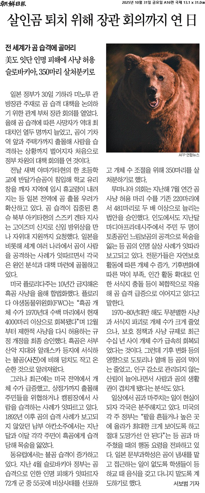 ② 전날 새벽 야마가타현의 한 초등학교에 반달가슴곰이 침입해 학교 유리창을 깨자 지역에 임시 휴교령이 내려지는 등 일본 전역에 곰 출몰 우려가 확산하고 있다. 곰 습격이 집중된 혼슈 북부 아키타현의 스즈키 겐타 지사는 고이즈미 신지로 신임 방위상을 만나 자위대 지원까지 요청했다. 일본을 비롯해 세계 여러 나라에서 곰이 사람을 공격하는 사례가 잇따르면서 각국은 원인 분석과 대책 마련에 골몰하고 있다.