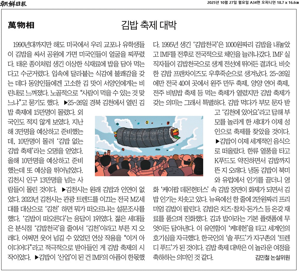 ⑤ 김밥은 치즈·참치·돈가스 등 온갖 재료를 품으며 진화했다. 김과 밥이라는 기본 플랫폼에 무엇이든 담아낸다. 이 유연함이 ‘케데헌’을 타고 세계인의 호기심을 자극했다. 한국인의 ‘솔 푸드’가 지구촌의 ‘트렌디 푸드’가 된 것이다. 김밥 축제 대박은 이 놀라운 여정을 축하하는 의미인 것 같다.