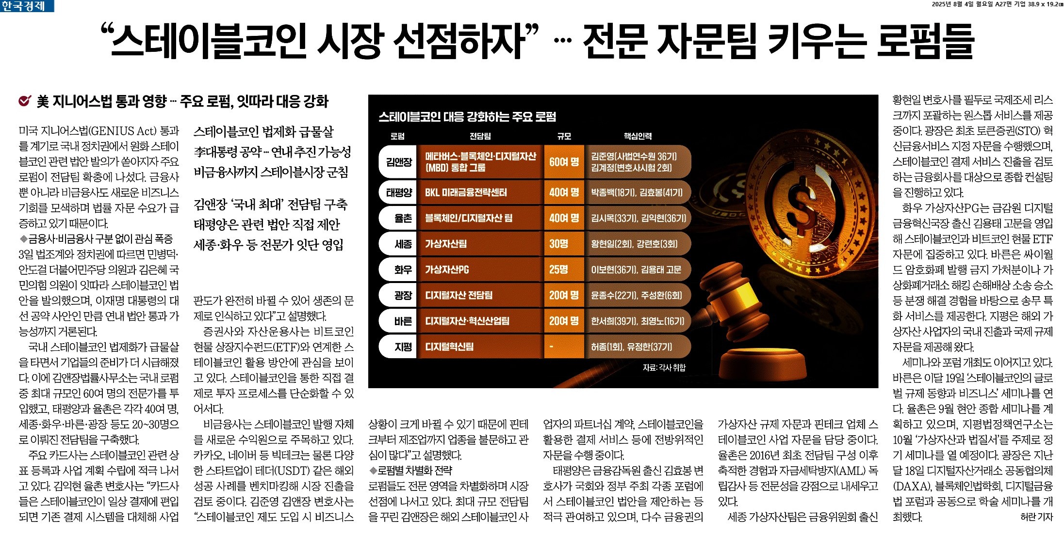 ② 국내 스테이블코인 법제화가 급물살을 타면서 기업들의 준비가 더 시급해졌다. 이에 김앤장법률사무소는 국내 로펌 중 최대 규모인 60여 명의 전문가를 투입했고, 태평양과 율촌은 각각 40여 명, 세종·화우·바른·광장 등도 20~30명으로 이뤄진 전담팀을 구축했다.