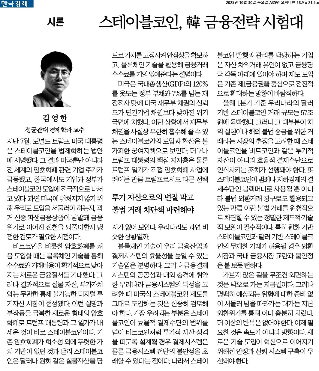 ① 지난 7월, 도널드 트럼프 미국 대통령은 스테이블코인을 법제화하는 법안에 서명했다. 그 결과 미국뿐만 아니라 전 세계의 암호화폐 관련 기업 주가가 급등했고, 한국에서도 기업과 정부가 스테이블코인 도입에 적극적으로 나서고 있다. 과연 미국에 뒤처지지 않기 위해 우리도 도입을 서둘러야 하는지, 과거 신종 파생금융상품이 남발돼 금융위기로 이어진 전철을 되풀이할지 냉정한 검토가 필요한 시점이다.