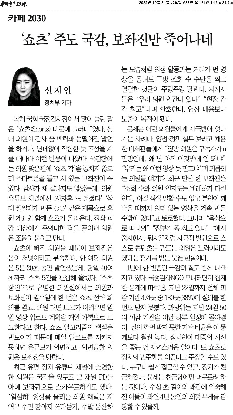 ② 감사가 채 끝나지도 않았는데, 의원 유튜브 채널에선 ‘사자후 또 터졌다’ ‘상대 쩔쩔매게 만든 ○○’ 같은 제목으로 후원 계좌와 함께 쇼츠가 올라온다. 정작 피감 대상에게 유의미한 답을 끌어낸 의원은 조용히 묻히고 만다.