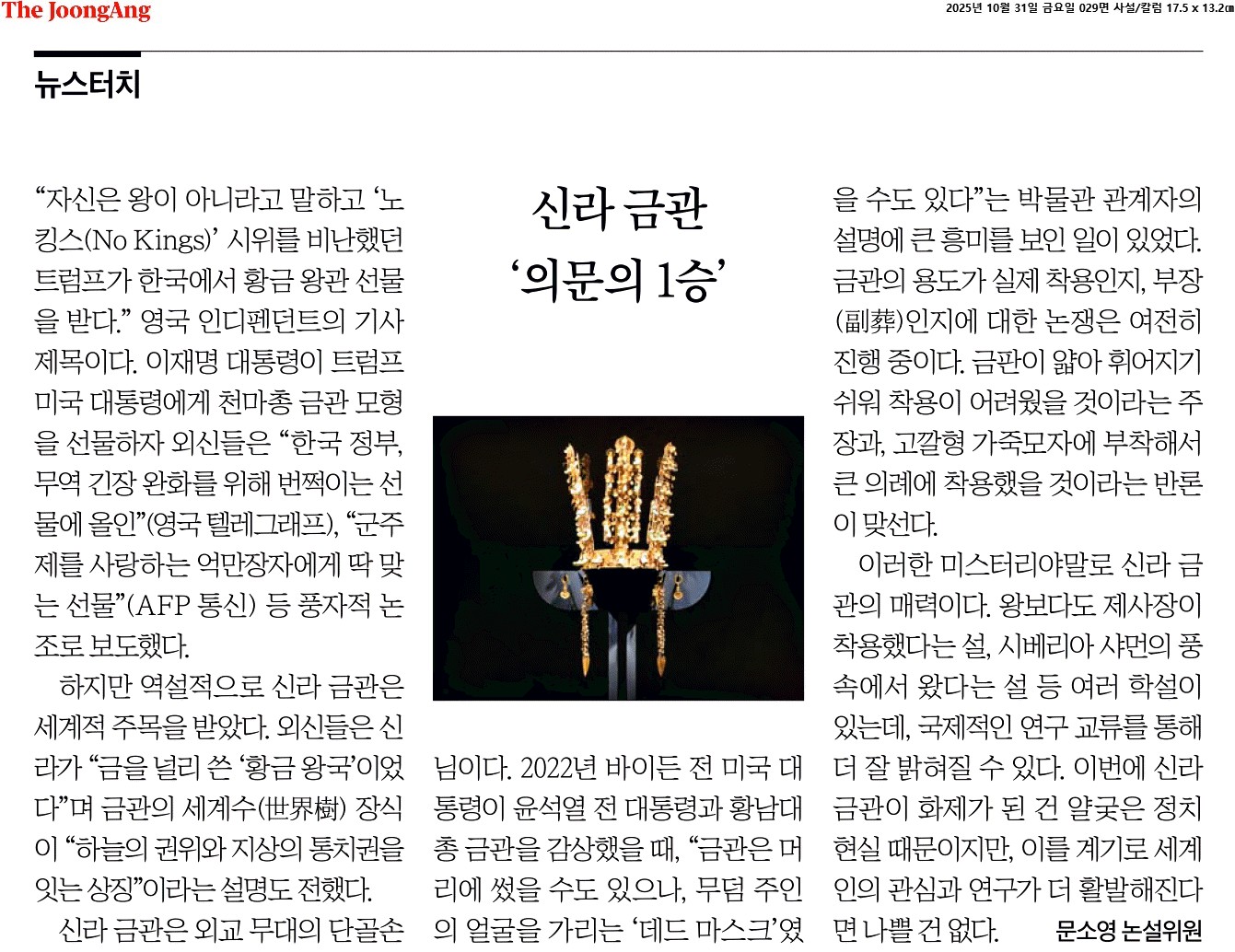 ① “자신은 왕이 아니라고 말하고 ‘노 킹스(No Kings)’ 시위를 비난했던 트럼프가 한국에서 황금 왕관 선물을 받다.” 영국 인디펜던트의 기사 제목이다. 이재명 대통령이 트럼프 미국 대통령에게 천마총 금관 모형을 선물하자 외신들은 “한국 정부, 무역 긴장 완화를 위해 번쩍이는 선물에 올인”(영국 텔레그래프), “군주제를 사랑하는 억만장자에게 딱 맞는 선물”(AFP 통신) 등 풍자적 논조로 보도했다.