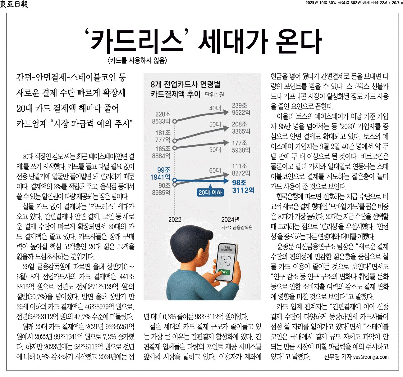 ① 실물 카드 없이 결제하는 ‘카드리스’ 세대가 오고 있다. 간편결제나 안면 결제, 코인 등 새로운 결제 수단이 빠르게 확장되면서 20대의 카드 결제액은 줄고 있다. 카드사들은 장래 구매력이 높아질 핵심 고객층인 20대 젊은 고객을 잃을까 노심초사하는 분위기다.