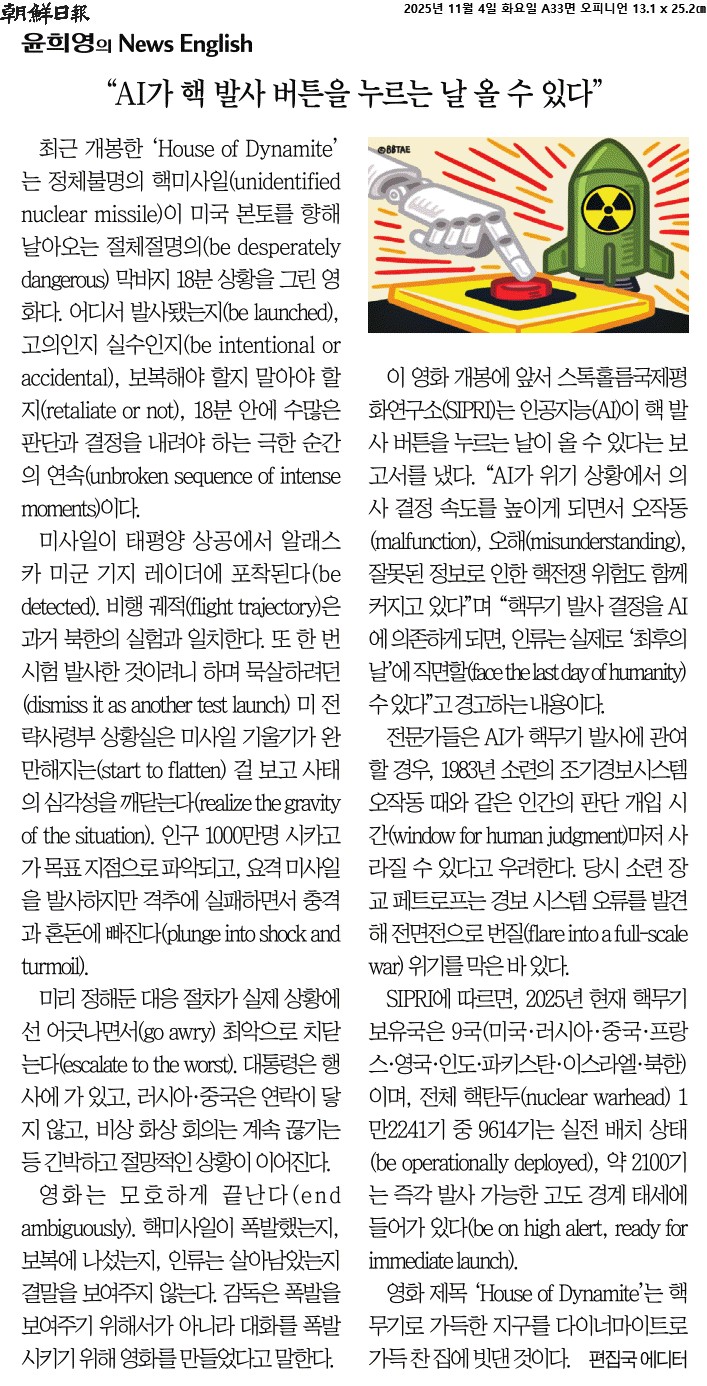 ① 최근 개봉된 ‘House of Dynamite’는 정체불명의 핵미사일(unidentified nuclear missile)이 미국 본토를 향해 날아오는 절체절명의(be desperately dangerous) 막바지 18분 상황을 그린 영화다. 어디서 발사됐는지(be launched), 고의인지 실수인지(be intentional or accidental), 보복해야 할지 말아야 할지(retaliate or not), 18분 안에 수많은 판단과 결정을 내려야 하는 극한 순간의 연속(unbroken sequence of intense moments)이다.